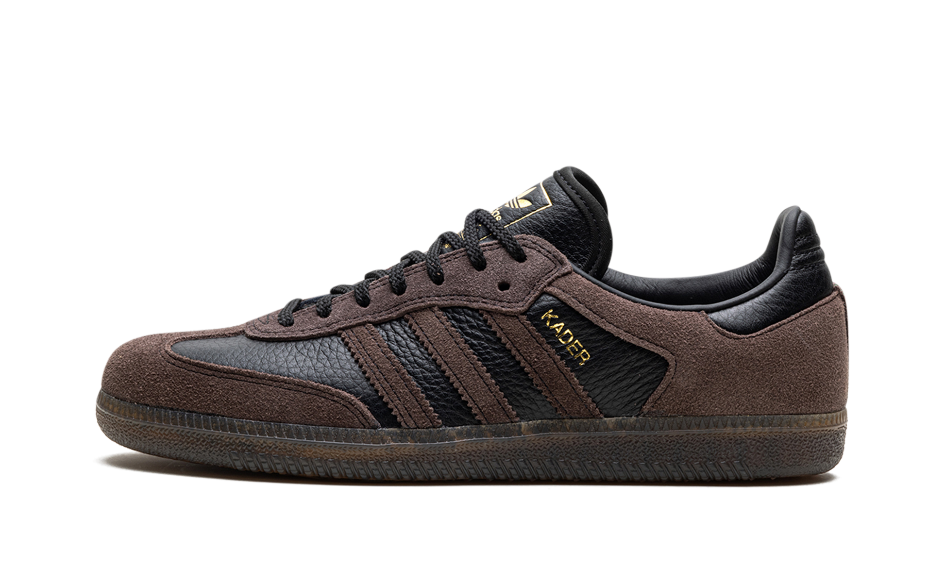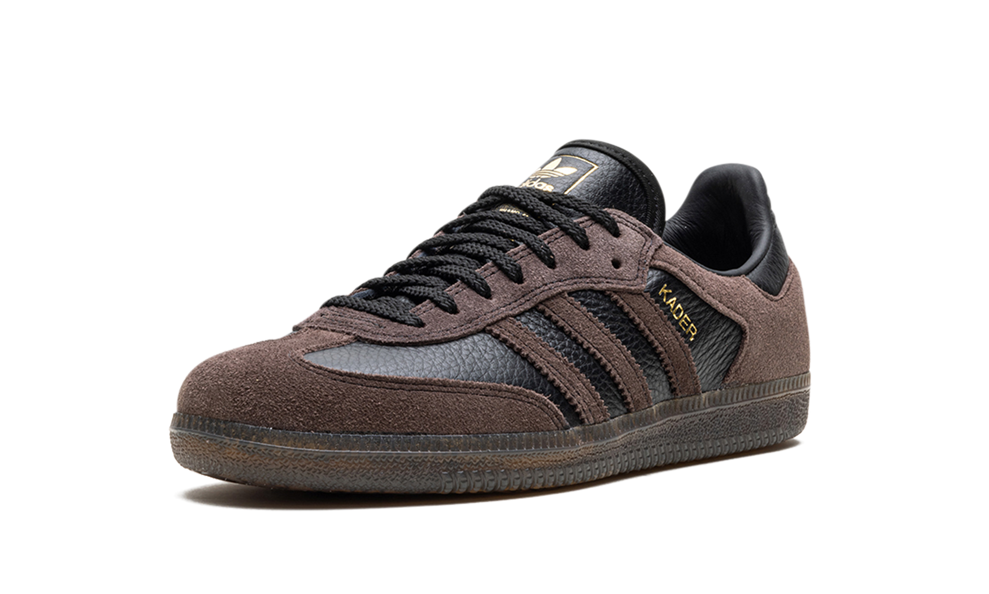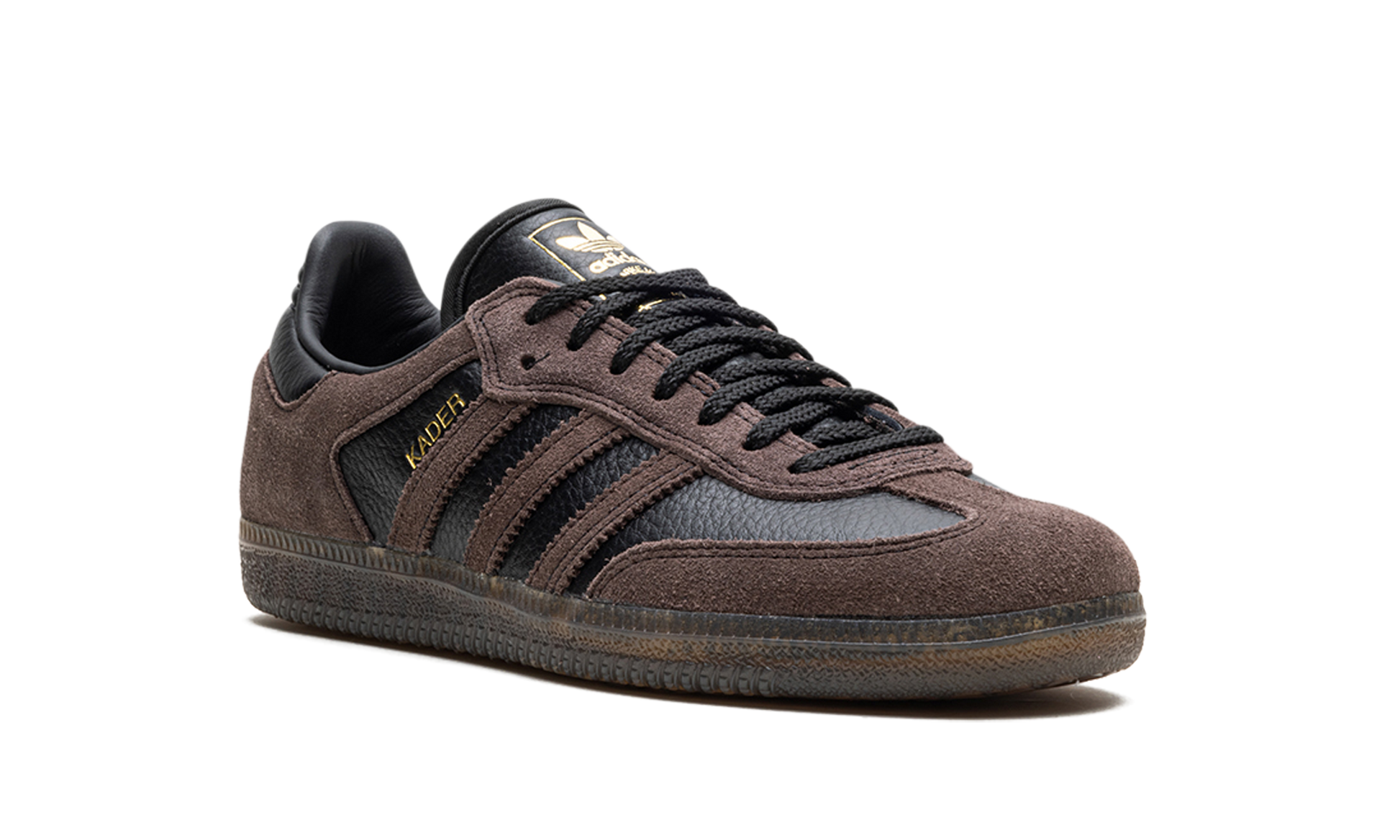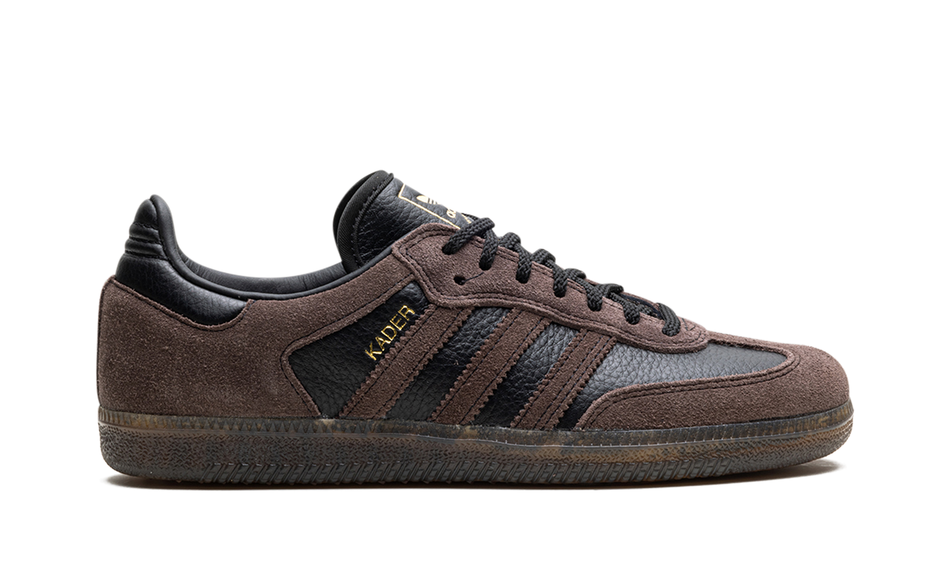 The adidas Samba ADV "Kader Sylla" is a collaboration between the professional skateboarder and adidas on a skate-ready version of the retro shoe. Modified specifically for skateboarding, the Samba ADV for Kader features a black tumbled leather base with brown suede overlays on the forefoot and heel, as well as on the Three Stripes branding. A “Kader” logo appears in gold foil next to the Three Stripes on the lateral side of the shoe. Underfoot, the gum rubber sole provides traction for optimal board feel or casual daily wear. Release date: February 10, 2024 Kader Sylla
