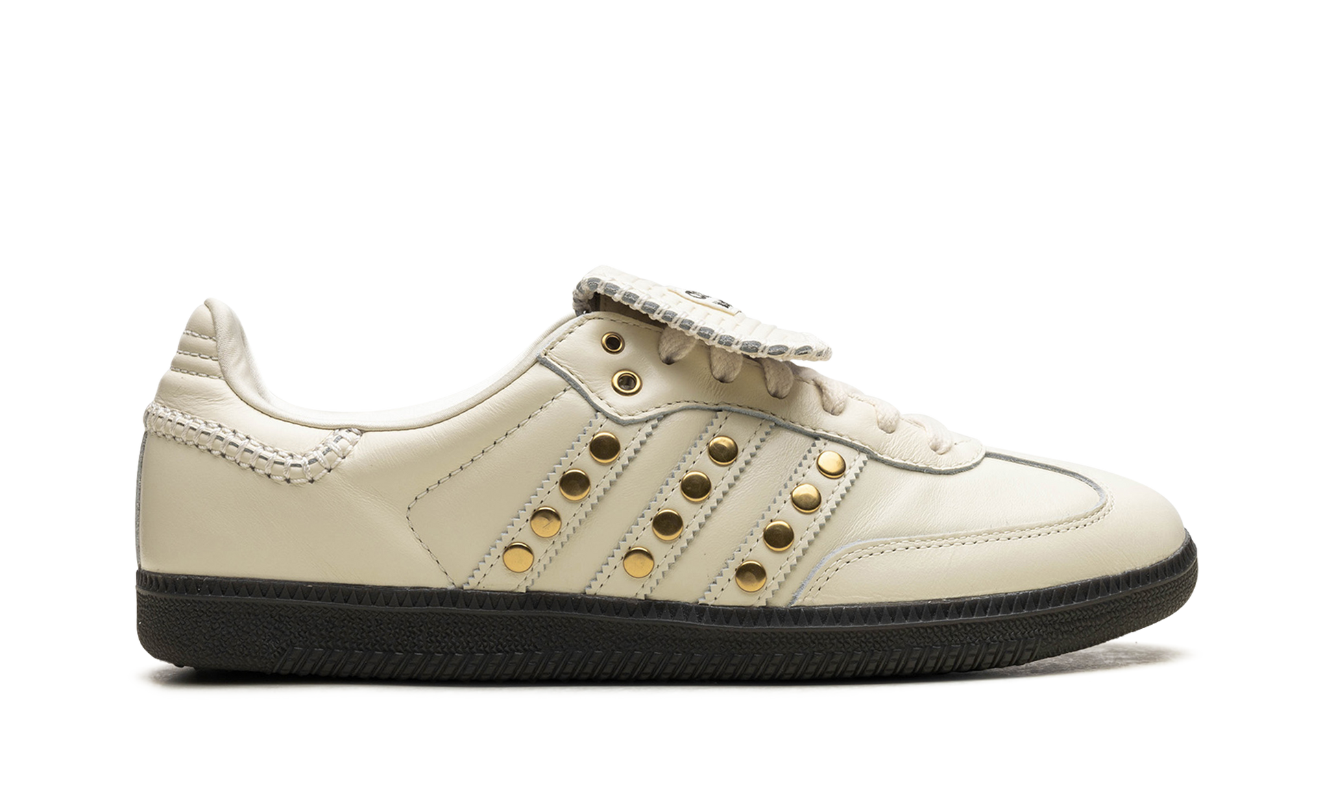 The Wales Bonner x adidas Samba "Studded Cream" is a collaboration by the talented fashion designer and adidas on a version of the retro shoe with metallic gold studs on its design. Grace Wales Bonner has played a key role in the resurgence of the adidas Samba, and with her “Studded Cream” colorway, continues her ultra successful collaborative history on the model. The “Studded Cream” features a Cream White leather construction with tonal leather overlays. The Three Stripes branding has metallic gold studs that give the shoe a decidedly high fashion-inspired look. Additional details include white stitching along the heel, a folded tongue, and a dark gum rubber sole. Wales Bonner - Studded Pack - Cream